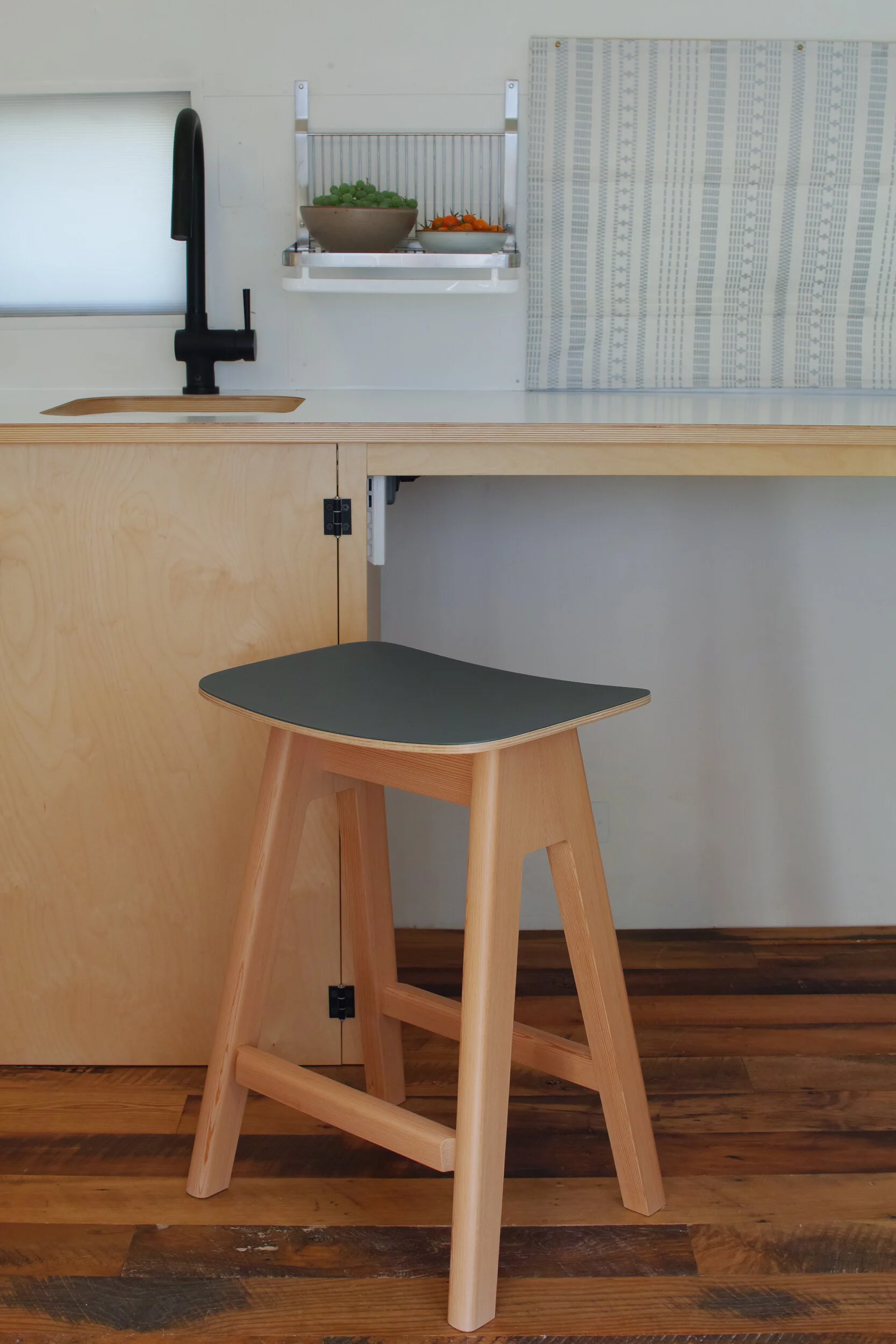 Shown in Douglas Fir with lino seat, this counter height stool is made to order in a select range of timbers and seat surfaces.